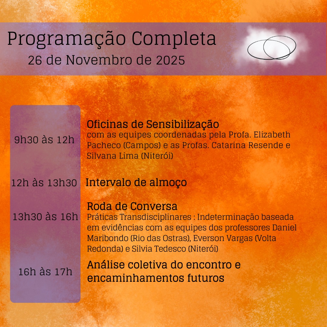 - 13h30-16h – Roda de conversa “Práticas Transdisciplinares: Indeterminação baseada em evidências”, com as equipes dos profes. Daniel Maribondo (Rio das Ostras), Everson Vargas (Volta Redonda) e Silvia Tedesco (Niterói) – Auditório do Instituto de Humanidades e Saúde