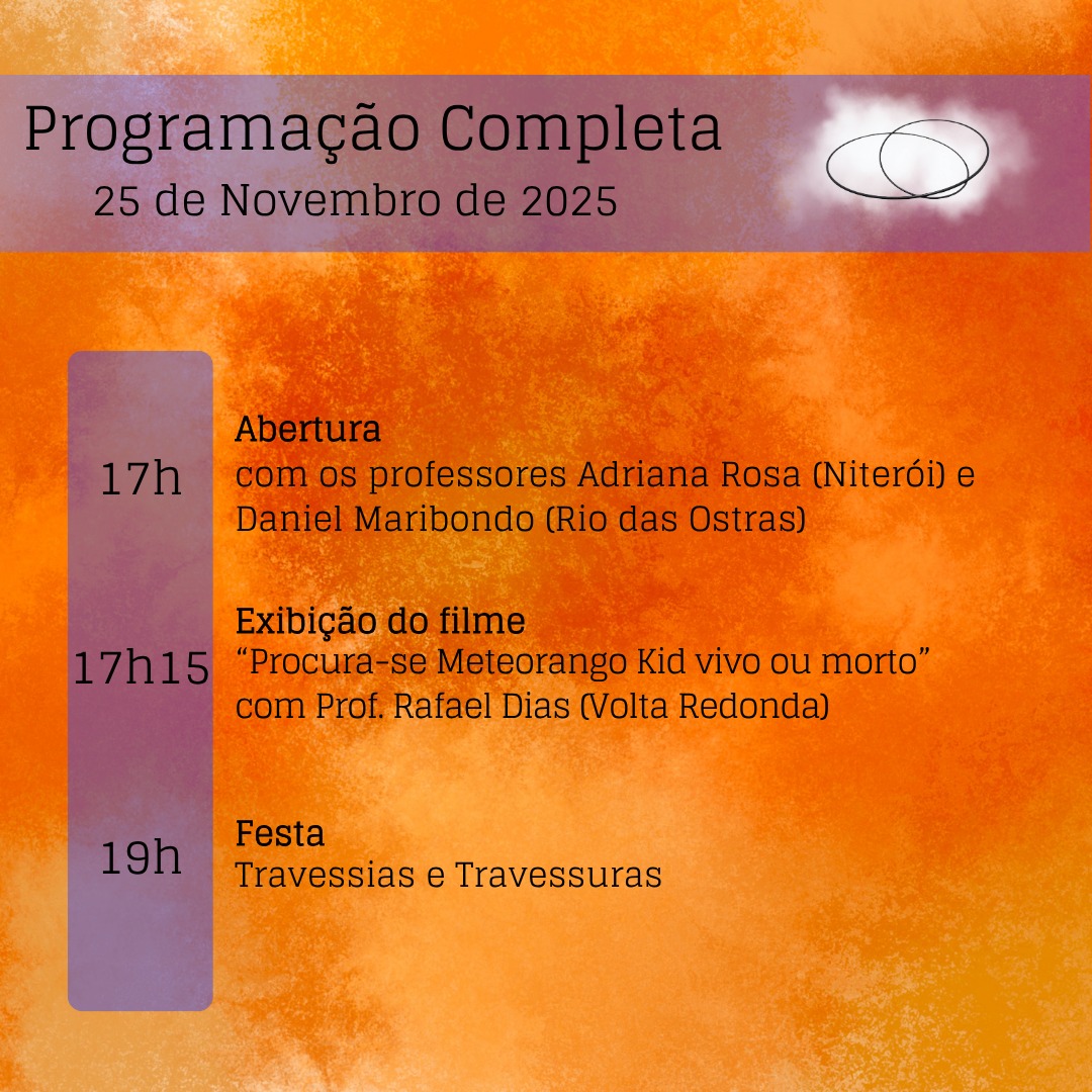 - 17h30 – Exibição do filme “Meteorango Kid vivo ou morto, seguido de debate com prof. Rafael Dias (Volta Redonda) – Auditório do Instituto de Humanidades e Saúde